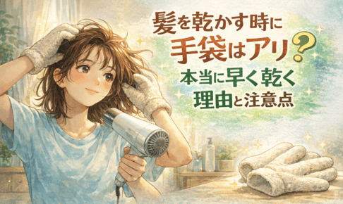 髪を乾かすとき手袋は本当に時短になる?吸水+温風で早く乾く仕組みと、摩擦でパサつかせない注意点を美容師目線で解説。ロング・毛量多めの方にもおすすめ。